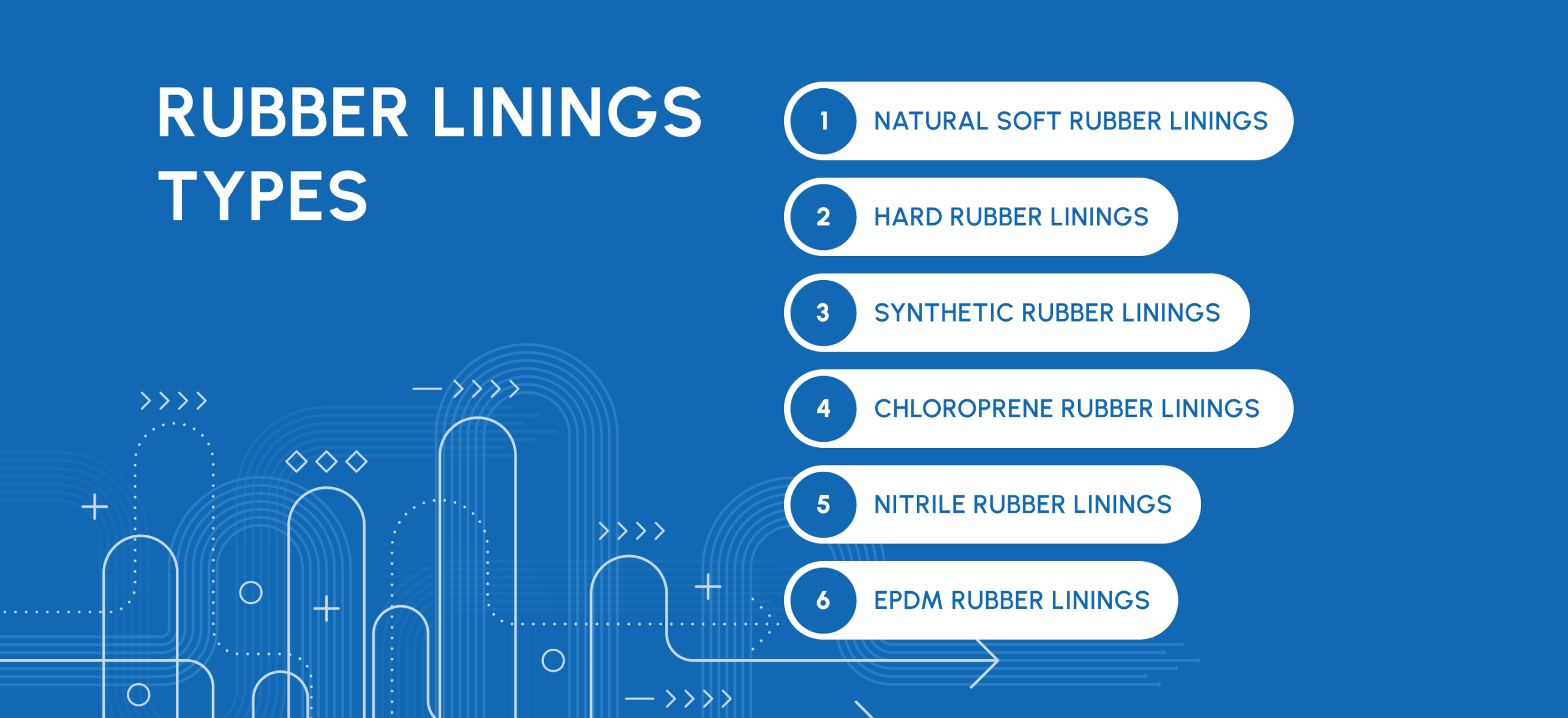 Some types of synthetic rubber used for lining are chloroprene, Nitrile (NBR), EPDM.